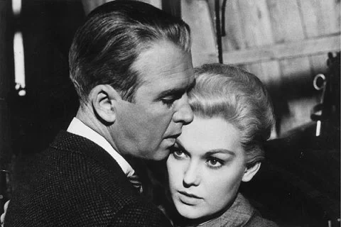 Another example of Scottie’s masculine progression is when Scottie first meets with Ester and the class power dynamic between the two men is set in motion though body language, the environment and the camera angles. The environment is set with an establishing shot of the phallic cranes navigating the natural landscape behind the window where the men sit. As the camera moves inside, we see the room full of heavy mahogany furniture, large ship models and aggressively red carpet. The power relationship is then coded into the dialogue and camera shots. For example, Scotties first asks how Ester got into the ship building business. Ester simply states, “I married into it,” which doesn’t fit into the stereotypical American self-made man trope of the 1950’s. To be a man in America in the 1950s was all about the hardworking, war-supporting family man. Ester then goes on to explain that he thinks this job is dull and really doesn’t need to be doing it, but feels the responsibility because his wife’s family is gone. It’s also important to note that this scene is shot from behind Scotties back with the emphasis on Ester. This foreshadows Ester’s ulterior motives in the conversation and Scottie’s blindness to that. Ester also states, “the things that spell San Francisco are dying fast.” This can be read as a very literal way of hinting to his intentions of fleeing