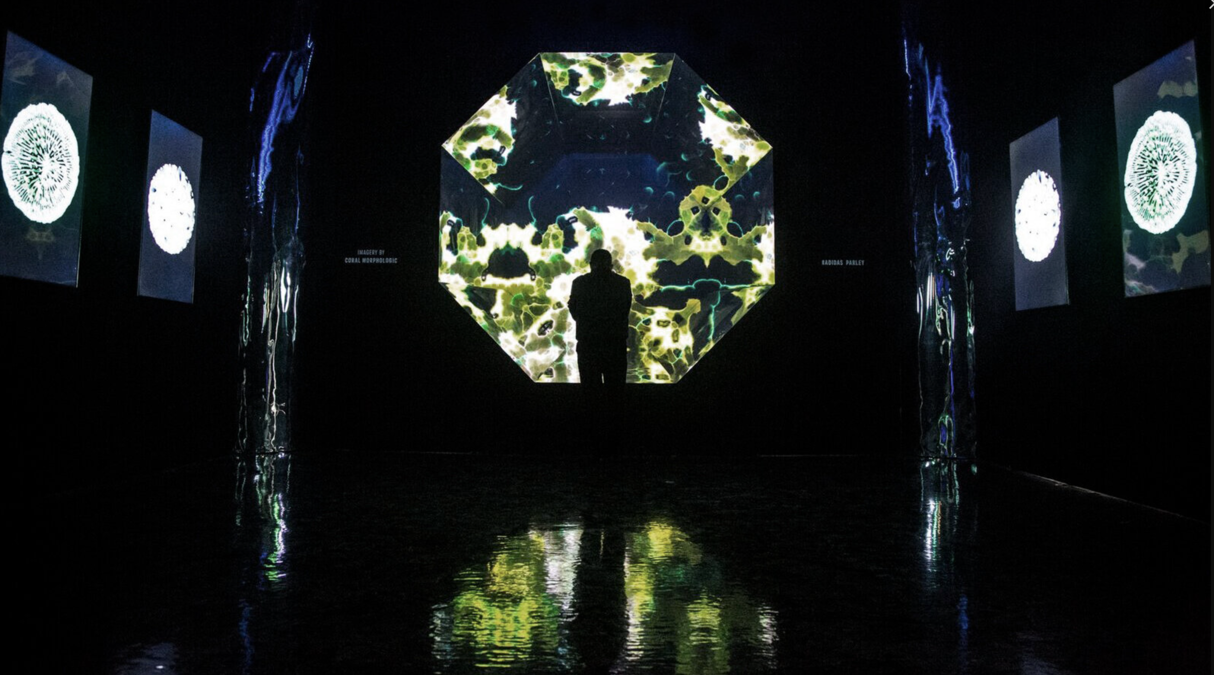 Commissioned by Adidas for NBA All-Star Weekend, this multi-room installation translated marine science into immersive storytelling. Caroline collaborated with coral biologist Colin Foord and musician J.D. McKay to produce a kaleidoscopic tunnel of macro coral imagery and a 40-foot shipping container screening oceanographic footage from whale research expeditions.